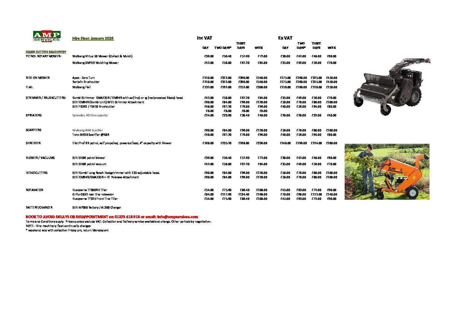 AMP has an extensive modern hire fleet consisting of aerators, blowers, brush cutters, flails, hedgecutters, lawn mowers, lawn tractors, scarifiers, shredders and strimmers.